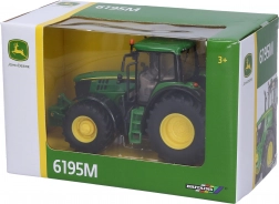 Modello dettagliato del trattore JOHN DEERE 6195M in scala 1:32, ideale per piccoli e grandi appassionati di macchine agricole. Struttura in metallo con dettagli in plastica, lunghezza 19 cm e ruote libere girevoli per un gioco facile e per l’esposizione.