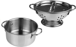 Il set include scolapasta, pentola, padelle, utensili da cucina in legno e supporto per organizzare tutti i componenti.