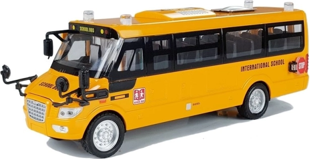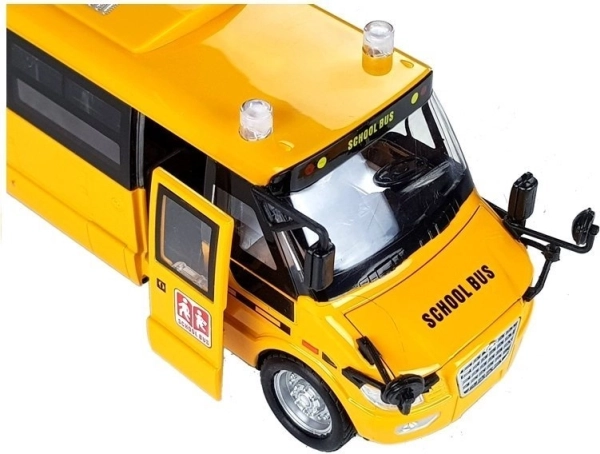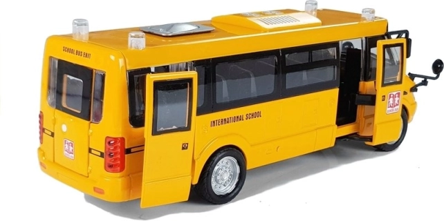 Le porte laterali e posteriori e il cofano si aprono; finestre trasparenti e particolari curati (specchietti, copricerchi, scritte) creano l’aspetto autentico di un autobus scolastico.