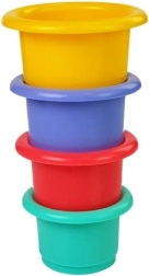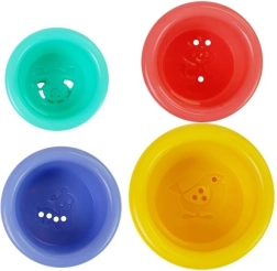 Il set include quattro diversi secchielli colorati con fori per osservare il flusso dell'acqua.