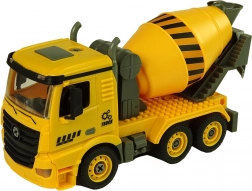 La betoniera gialla e grigia con tamburo miscelatore rotante e pneumatici realistici trasporta i bambini direttamente al cantiere.