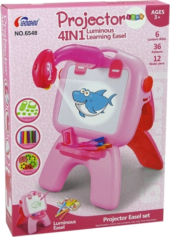 Proiettore, 36 stencil di immagini, 6 dischi con immagini, 12 pennarelli colorati, 12 gessetti colorati, stencil di forme geometriche, stencil di lettere, pennarello luminoso