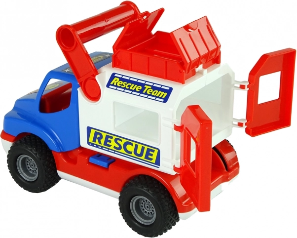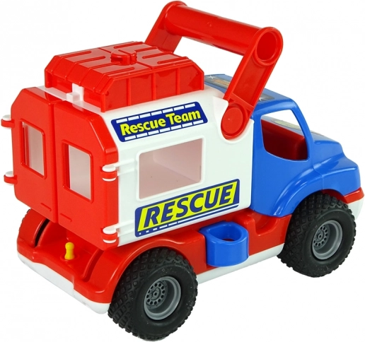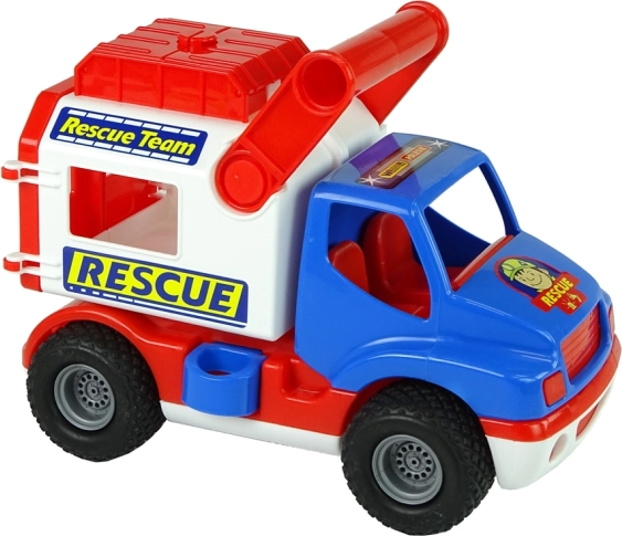 Il veicolo è dotato di ruote in gomma con battistrada antiscivolo per una marcia fluida, ha il portellone posteriore rosso apribile e un vano superiore per i piccoli oggetti. Il blocco laterale mantiene stabile la sovrastruttura: una volta sbloccata diventa mobile e si può ribaltare all’indietro con una leva. Gli adesivi a tema “Rescue/Rescue Team” favoriscono il gioco di ruolo.