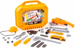 Il set di attrezzi per bambini è progettato per i piccoli fai-da-te che vogliono imitare mamma o papà durante i lavori in officina e in giardino. Tutti gli elementi sono in plastica resistente, sicuri per il gioco e facili da riporre nella robusta valigetta. La smerigliatrice, premendo il pulsante, fa ruotare il disco; la maschera protettiva ha un elastico, quindi si adatta a tutti.