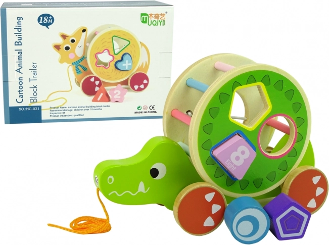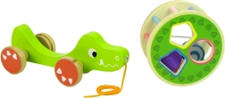 Il giocattolo in legno a forma di coccodrillo con sorter offre una serie di elementi educativi. Il grande cerchio con sorter e i tre blocchi sul dorso permettono di esercitare precisione, riconoscimento delle forme geometriche e migliorano concentrazione e pensiero logico. Il coccodrillo è dotato di bastoncini colorati che stimolano i sensi visivi del bambino e le ruote con corda facilitano il movimento del giocattolo. I blocchi all'interno funzionano come un sonaglio, il che attira e stimola i sensi uditivi del bambino. L'anello rimovibile sul dorso del coccodrillo consente più varianti di gioco.