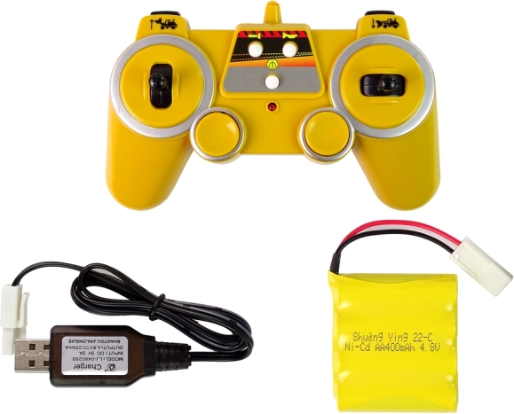 Il radiocomando opera a 2,4 GHz ed è molto semplice da usare: due joystick consentono manovre comode. Con esso l’operatore può guidare, cambiare direzione avanti/indietro e destra/sinistra. Si muove su cingoli e il braccio della scavatrice si alza e si abbassa. È realizzato in scala 1:20 ed è decorato con dettagli neri e adesivi accattivanti.