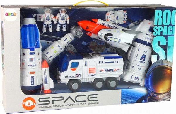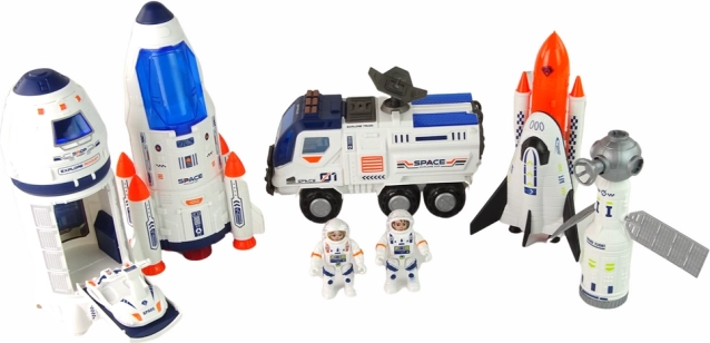 L’elemento centrale del set è un grande razzo spaziale nei colori blu e bianco. Presenta dettagli accurati, compresi motori a razzo, portelli di accesso e finestrini della cabina. In cima al razzo è collegata, tramite connettori, un’astronave. L’astronave è anch’essa blu e bianca e ha una cabina apribile per gli astronauti.