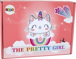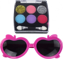 - 2× rossetto (rosso), palette ombretti (rosa, viola, blu, glitter argento e oro), 2× palette per contouring, occhiali rosa per bambine a forma di cuore, pennelli per trucco, separatore per le dita, lima per unghie, 2× smalto per unghie, custodia in plastica a donut con catenella