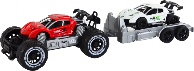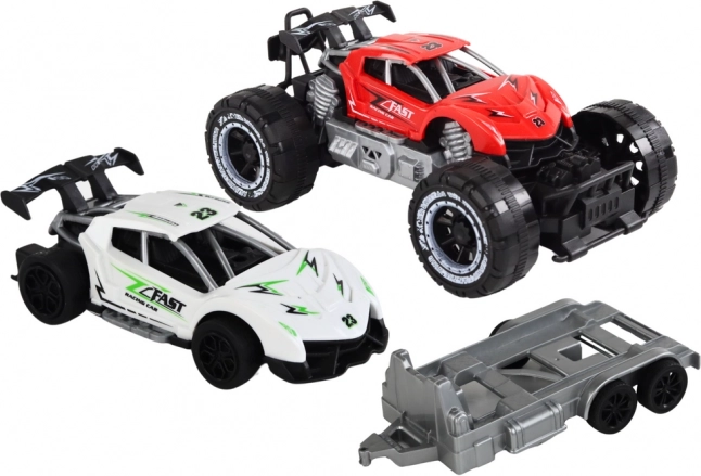 Dietro l'auto è agganciato un rimorchio su cui si trova una piccola auto sportiva bianca, pronta per nuove sfide. Ciò che rende davvero eccezionale questo set è la sua straordinaria funzionalità. Il rimorchio può essere staccato dall'auto rossa in qualsiasi momento, dandoti la possibilità di creare storie ancora più complesse e sviluppare l'immaginazione del tuo bambino.