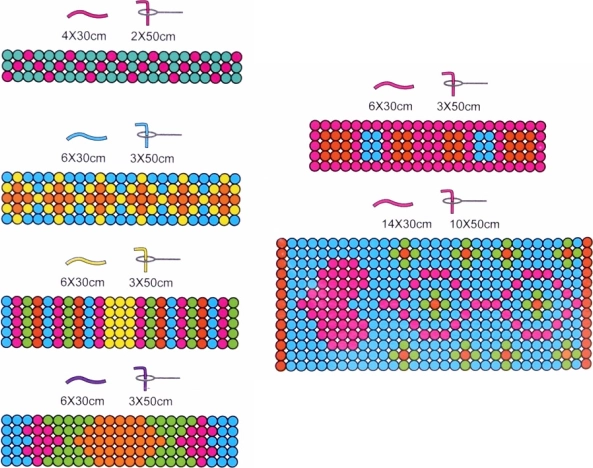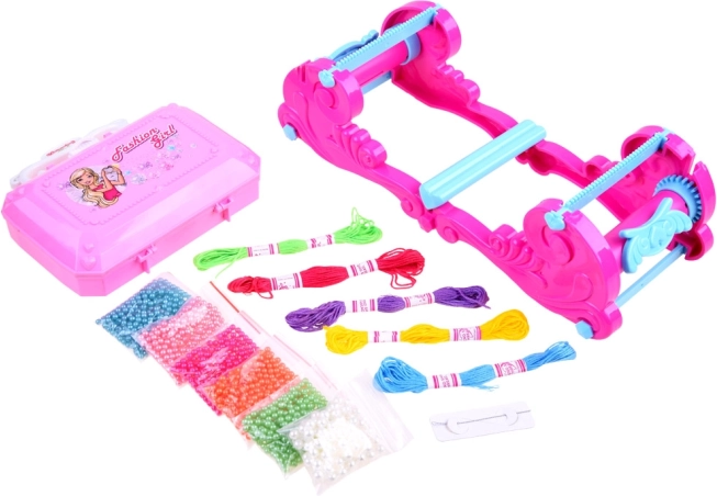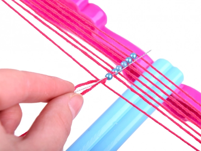 Il telaio rosa e azzurro mantiene i fili ben fermi e facilita l’infilatura delle perline e la creazione di motivi regolari.