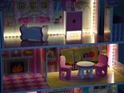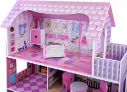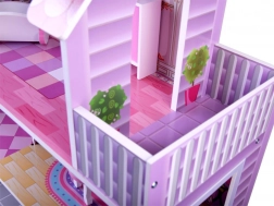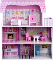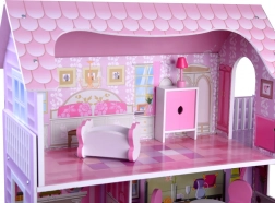 Casetta per bambole in legno rosa con mobili e illuminazione LED
