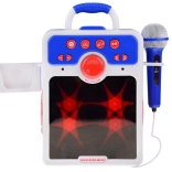 Goditi musica e divertimento con il nostro Boombox blu per bambini! Questo fantastico altoparlante è ideale per i bambini che amano cantare, fare i DJ o ballare. Offre un divertimento sorprendente con il karaoke. Realizzato in plastica di alta qualità con grande attenzione ai dettagli, questo altoparlante colpisce per il pannello frontale a specchio che, una volta acceso, lampeggia e riflette luci colorate.