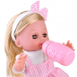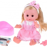 La bambola è vestita con bellissimi abiti bianchi e rosa con un motivo floreale e una maglietta bianca. È equipaggiata con la funzione di minzione, permettendo ai bambini di imparare a prendersi cura di un bebè. Offre una sensazione realistica grazie alla testa, alle braccia e alle gambe in gomma dura.