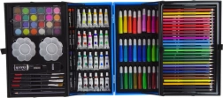 Set artistico completo in valigetta include tutti gli strumenti essenziali, come matite colorate, pennarelli, colori ad acquerello e pastelli a olio. Ogni sezione è progettata per conservare oggetti specifici, portando ordine nel creare.