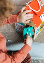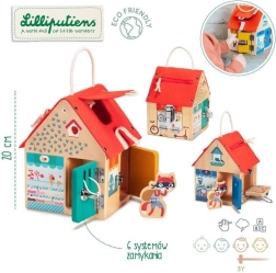 Questa casetta, realizzata con cura dal marchio belga LILLIPUTIENS, offre un'attività diversa su ogni lato e anche sul tetto. I bambini apriranno e chiuderanno le porticine di vari “negozietti” (ciclo, pasticceria, gioielleria, alimentari) e scopriranno 6 tipi di chiusure: chiave, catenaccio scorrevole, chiavistello, gancio, cerniera e velcro. Il tetto in tessuto è robusto e fissato con bottoni a pressione; la casetta ha anche una maniglia in corda per un facile trasporto.