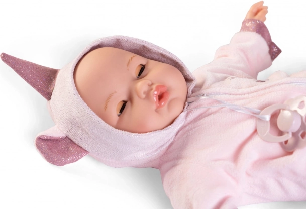 La bambola emette suoni autentici di bambino che piange e dice "mamma", "papà", quando si rimuove il ciuccio.