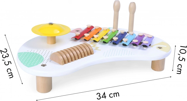 Il tavolino musicale per bambini ECOTOYS è la scelta ideale per i piccoli musicisti. Offre un variopinto xilofono a 8 toni, un piatto dal suono chiaro e una raspa in legno per accompagnamenti ritmici. Grazie alle due bacchette in legno, i bambini possono sperimentare facilmente diverse sfumature sonore ed esercitare la coordinazione occhio–mano.