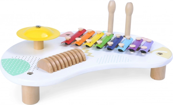 Scoprite il divertente tavolino musicale in legno ECOTOYS, che sviluppa la motricità fine, la creatività e il senso del ritmo. Tre strumenti in uno – xilofono colorato, piatto e raspa (guiro) – e una coppia di bacchette invitano i bambini dai 18 mesi a esplorare i suoni e a fare le prime esperienze musicali. Struttura sicura e stabile in legno con piacevole grafica colorata per ore di gioco e apprendimento gioioso.