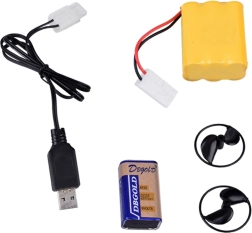 Inclusi batteria da 7,2 V, batteria da 9 V per il radiocomando, cavo di ricarica USB, eliche di ricambio e pratico supporto.