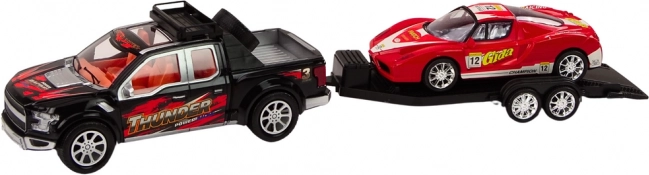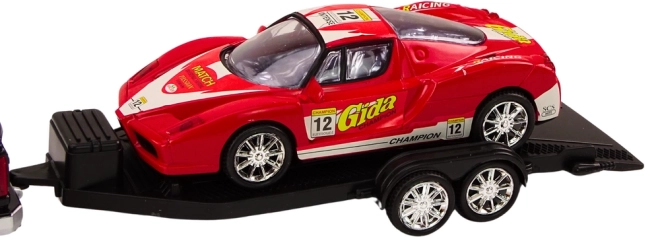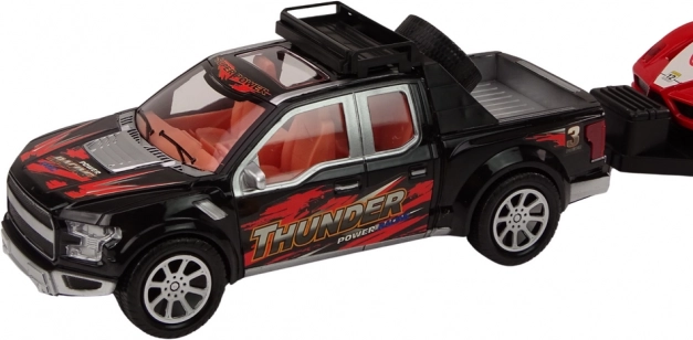 Il pickup con grandi ruote nere traina con sicurezza il rimorchio con l’auto sportiva e, grazie al meccanismo a frizione, dopo la carica avanza senza batterie. Il rimorchio sganciabile permette di cambiare rapidamente gioco: i bambini possono trasportare l’auto oppure giocare con ciascun modello separatamente. L’auto sportiva rossa colpisce per le linee eleganti e si può caricare e scaricare con facilità.