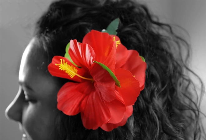 Il fiore di ibisco realizzato in tessuto combinato con plastica appare molto realistico e ravviva qualsiasi acconciatura.