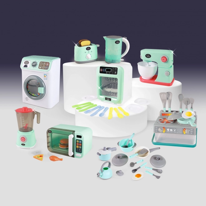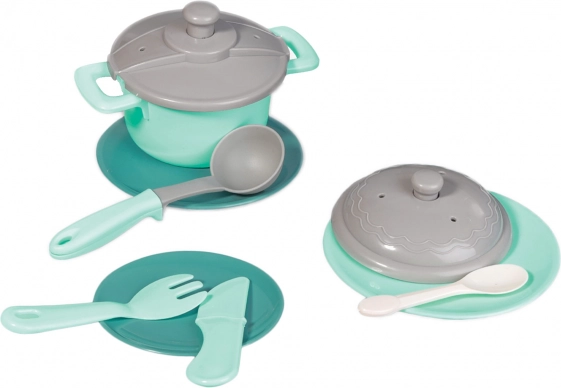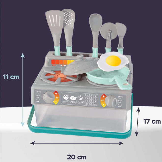 Questo set cucina per bambini in colore grigio e turchese contiene tutto ciò di cui i bambini hanno bisogno per giocare a fare i cuochi. Il set include: