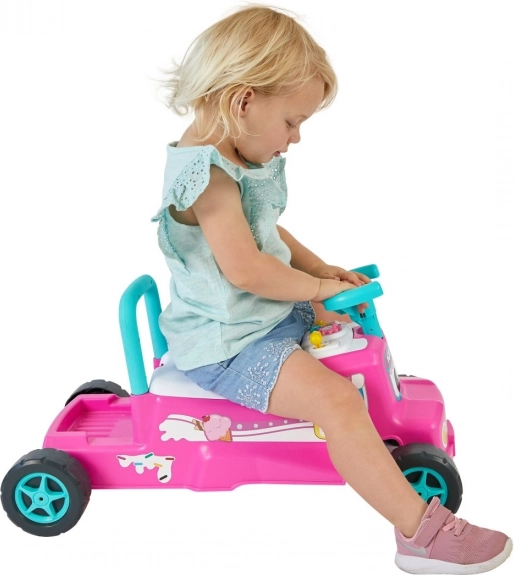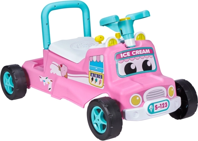 Adorabile cavalcabile rosa in stile camioncino dei gelati che sviluppa la motricità e la fantasia. Offre musica e luci lampeggianti, clacson e volante, vano portaoggetti sotto il sedile e maniglia posteriore come supporto per i primi passi.