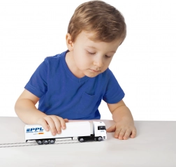 Scopri il modello di camion PPL realizzato nei dettagli, che riproduce fedelmente un vero trattore logistico. La cabina in metallo garantisce resistenza, mentre il rimorchio in PVC con logo PPL autentico colpisce a prima vista. Grazie alla ruota libera, il modello si muove con fluidità su superfici piane ed è ideale sia per il gioco di trasporto delle “spedizioni” sia per l’esposizione in vetrina.