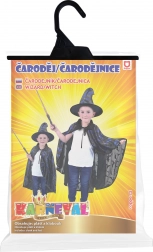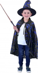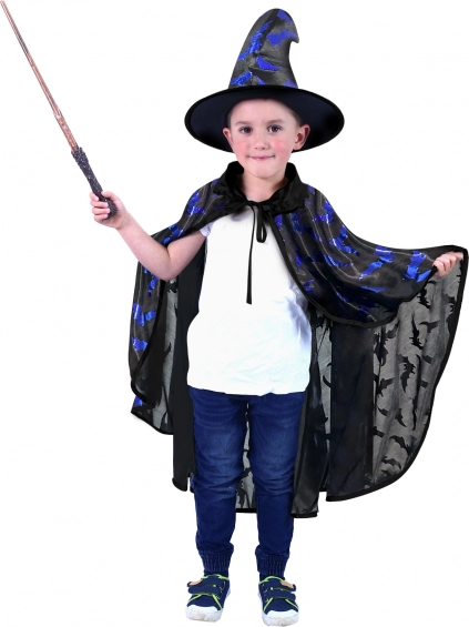 Set elegante per piccoli maghi e streghe per carnevale, feste e Halloween. Include un mantello nero con motivo blu‑viola di pipistrelli e un cappello coordinato. Costume leggero e confortevole per bambini 3–7 anni con lunghezza 72 cm, in cui potranno brillare e divertirsi senza limiti.
