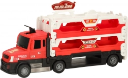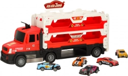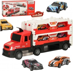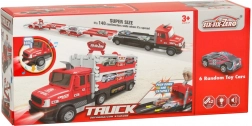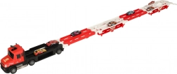 Il grande camion rosso funge da trasportatore di auto e allo stesso tempo da playset con circuito di gara nascosto. Una volta aperto, si crea una pista lunga su cui le 6 macchinine incluse possono sfidarsi. La rampa di lancio integrata dà una spinta potente alla partenza, mentre luci e suoni esaltano l’atmosfera delle vere competizioni.
