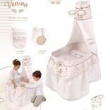 Questa culletta per bambole dal design raffinato è armonizzata in morbide tonalità pastello beige e bianco con discreti pois e righe. L’aspetto naturale è completato da fiocchetti che ricordano petali di fiori e da piccole ricamate apine, che sottolineano il fascino dell’intera collezione VERONA. Grazie alle ruote piroettanti, la culla può essere spostata facilmente da una stanza all’altra, così la piccola premurosa avrà sempre vicino il suo bebè.
