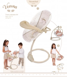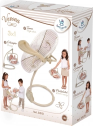 Elegante e pratica set 3 in 1 per bambole della collezione Verona che unisce seggiolone, altalena e portabebè in un unico prodotto. Grazie al sedile removibile e reversibile con cinture di sicurezza e al vassoio in plastica, il gioco è facile e sicuro. Il design moderno nei delicati colori naturali, l’alta qualità e la maneggevolezza entusiasmeranno ogni bambino dai 3 anni in su.