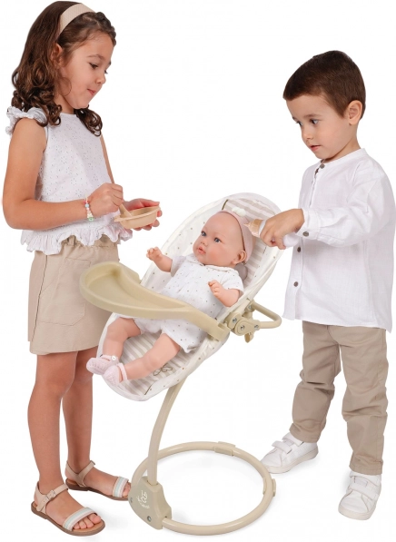 Questo seggiolone e altalena per bambole 3 in 1 della collezione Verona offre ai bambini un gioco realistico e tante possibilità di cura del loro bambolotto preferito. L’abbinamento di beige chiaro e bianco con motivi a pois e righe, rifinito con bordi discreti e applicazioni a fiocchetto, crea un look naturale senza tempo ispirato al design spagnolo.