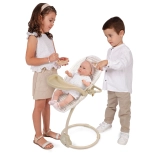 Grazie al sedile removibile e reversibile, il prodotto può essere utilizzato come seggiolone con vassoio, come altalena rilassante o come portabebè autonomo. La robusta struttura in metallo si unisce a elementi in plastica leggeri e a un morbido rivestimento tessile per il comfort della bambola e una facile manutenzione.