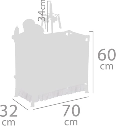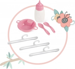 Il set include tutto per una cura completa: culla con finestra trasparente in rete, giostrina con foglioline, fasciatoio, seggiolone con set in plastica (biberon, ciotola, posate) e grande guardaroba con zip con asta e 3 appendini. Grazie alla struttura salvaspazio, l’intero complesso è facile da maneggiare e, dopo il gioco, si riordina rapidamente.