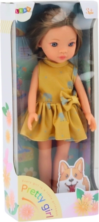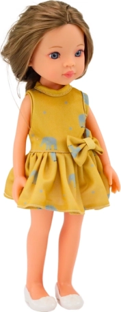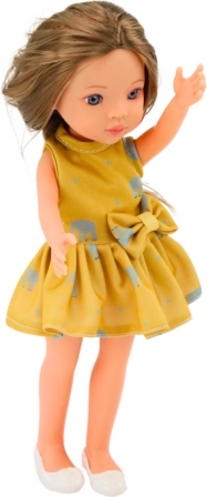 Il dolce burattino alto 33 cm è ideale per il divertimento quotidiano. Ha un trucco leggero, indossa un abito giallo con motivi a elefanti e scarpe bianche. L'acconciatura elegante stimola la creatività dei bambini.