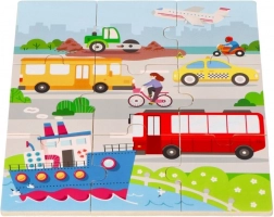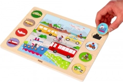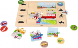 Scopri un gioco divertente ed educativo per i più piccoli: puzzle in legno VIGA con tema mezzi di trasporto. I bambini compongono prima il puzzle centrale e poi abbinano i dischetti rotondi ai contorni sulla tavola. Il gioco sviluppa motricità fine, coordinazione mano–occhio, pensiero logico e vocabolario ed è realizzato con materiali in legno sicuri e illustrazioni colorate.