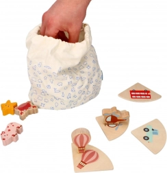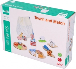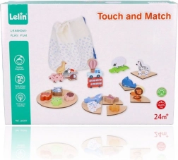 Questo gioco in legno tipo “Touch & Match” del marchio LELIN aiuta i bambini a riconoscere forme e immagini tramite il tatto. I pezzi in legno colorati con motivi di animali, mezzi di trasporto e oggetti si abbinano alle basi corrispondenti, mentre il bambino cerca il pezzo giusto a occhi chiusi nel sacchetto in tessuto.