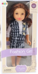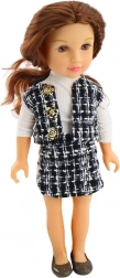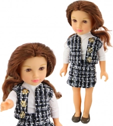 La bambola vanta un abbigliamento elegante composto da una gonna a quadri bianca e nera e un gilet che insieme creano uno stile unico. Una camicia bianca a maniche lunghe completa il look classico.