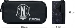 L'astuccio nero con emblema e scritta Wednesday colpisce per l'aspetto originale e i dettagli curati che valorizzano il tuo stile a scuola e in viaggio.