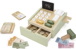 La cassa in legno nel piacevole colore verde è un ottimo gioco educativo per bambini dai 3 anni. Offre elementi funzionali come cassetto estraibile, tasti, scanner, terminale per carta e rotolo di carta, che riproducono fedelmente una cassa reale. È inclusa anche una mini lavagnetta bifacciale per annotare i conti.