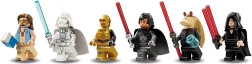 Goditi duelli dinamici grazie a due lanciatori a molla, cannoni girevoli e cabina di pilotaggio rimovibile, oltre alla torretta di tiro per due minifigure. Sei personaggi esclusivi, tra cui Darth Jar Jar, Jedi Vader e il Luke “da spiaggia”, completano le iconiche spade laser e gli accessori a tema (come la cassa con latte blu).