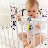 Facile da fissare al lettino o alla carrozzina grazie ai nastri e la sua struttura leggera lo rende ideale per i viaggi. Aiuta a sviluppare vista e tatto, insieme a conoscenze di base sugli animali.