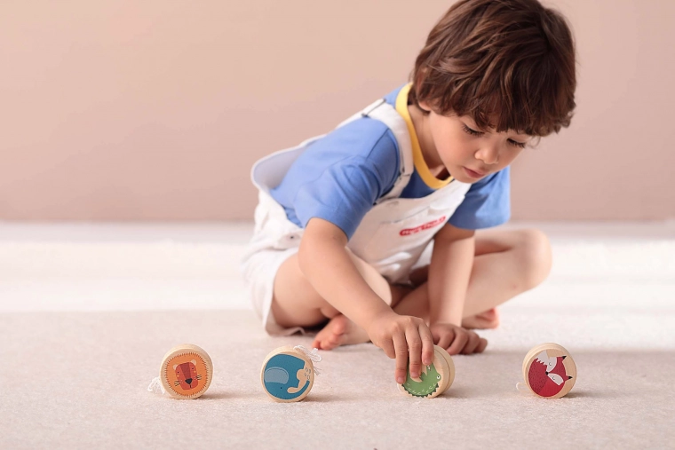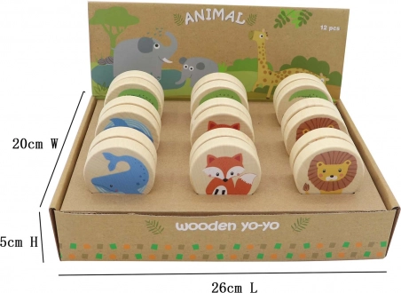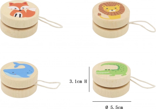 Yo-yo in legno per bambini di dimensioni 5,5 cm, ideale per lo sviluppo della motricità. Quattro varianti animali, giocattolo ideale.