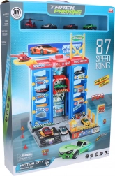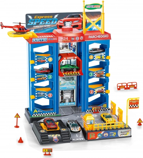 Fantastica stazione di parcheggio per piccoli conducenti, offre 3 auto in metallo e un elicottero in metallo con eliporto. Non mancano ascensore manuale, stazione di rifornimento e sbarra. Con un semplice movimento della leva si libera l’auto dal posto auto. Le dimensioni della stazione sono 30 × 27 × 37 cm, la lunghezza delle macchinine è 7 cm.