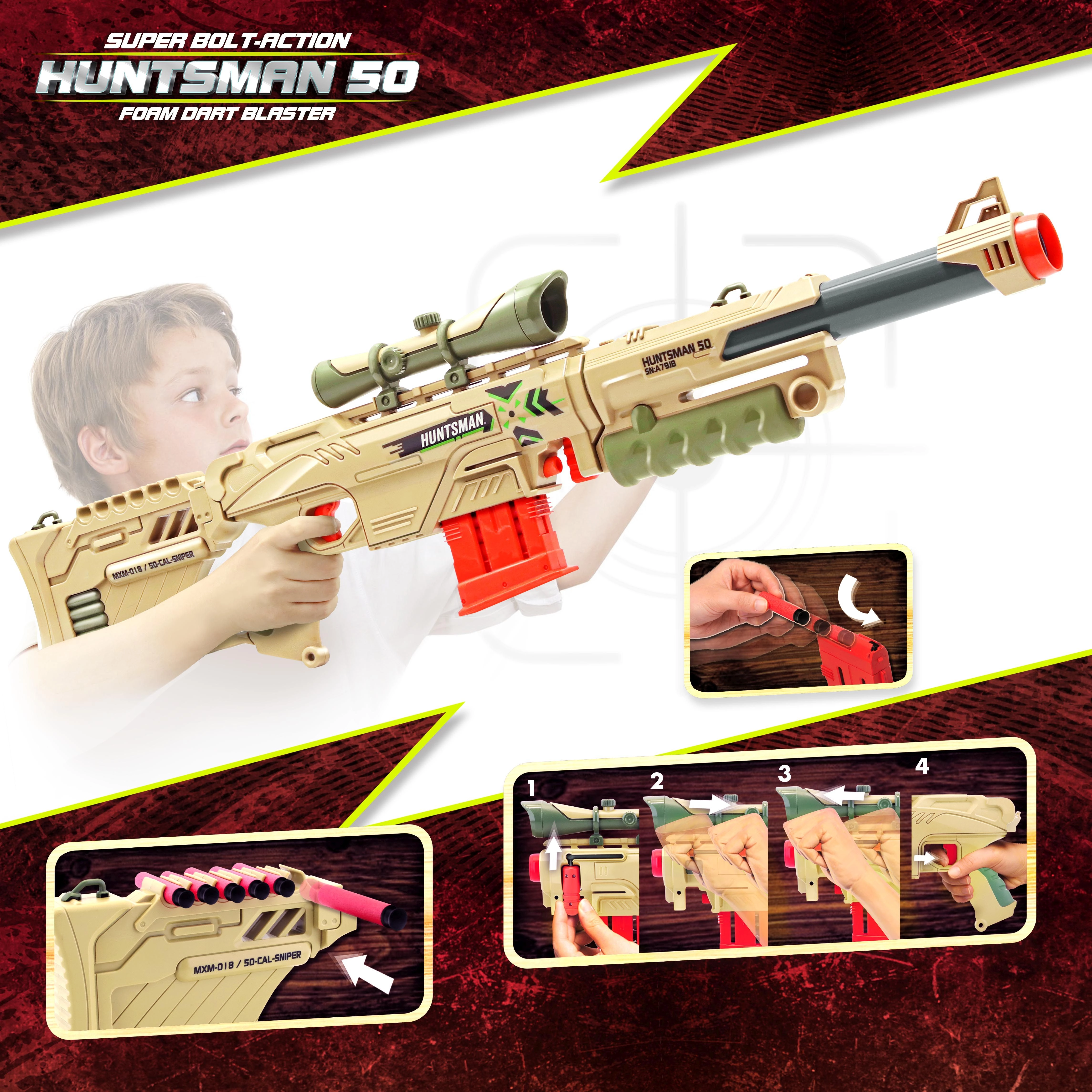 Huntsman Sniper Blaster è un giocattolo versatile per piccoli tiratori e appassionati collezionisti. Grazie alla struttura modulare puoi passare in poco tempo da un lungo fucile da cecchino a un blaster compatto a mano. La maneggevolezza leggera, i dardi in foam sicuri e il design accattivante garantiscono ore di gioco sicuro e creativo.