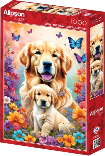 Il puzzle "Amore materno – Cani" di Alipson è un meraviglioso rompicapo da 1000 pezzi che raffigura un momento toccante tra una mamma cane e il suo cucciolo. Circondati da fiori variopinti e farfalle, questi cani creano un'immagine piena di amore e armonia.