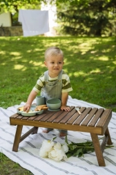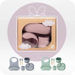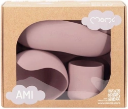 MoMi AMI è un set di stoviglie pensato per aiutare i bambini a imparare a mangiare in autonomia. Il set include: una ciotola e un piatto con ventose, una tazza, posate con manici in legno e un bavaglino comodo e morbido con tasca. Le stoviglie MoMi AMI sono realizzate in silicone sicuro per il contatto con gli alimenti. Non contengono BPA né ftalati. Le stoviglie sono fornite in una colorata confezione regalo!