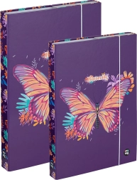 Pratico set di box porta-quaderni nei formati A4 e A5 con motivo farfalla protegge in modo affidabile il materiale scolastico. Grazie alla superficie laminata resistente e alla chiusura con elastico mantiene quaderni, fogli e accessori al sicuro e ben organizzati.