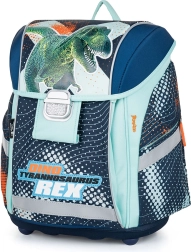 Set scolastico leggero ed ergonomico per i più piccoli con il popolare motivo T-Rex. Include uno zaino alleggerito da 900 g con imbottitura traspirante e cinturino pettorale, oltre a una sacca pratica per ginnastica e un astuccio a un piano senza contenuto. Il set offre tante tasche, un divisorio interno e elementi riflettenti per la sicurezza nel tragitto da e verso la scuola.